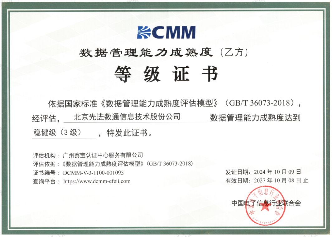 近日,中国电子信息行业联合会公布了最新一批通过数据管理能力成熟度(DCMM)贯标等级认证的企业名单。UED·(中国区)成功获得数据管理能力成熟度稳健级(三级)认证。这一认证的获得,标志着UED·(中国区)在数据治理体系构建和数据管理与应用能力方面,已经达到了国家权威机构认可的标准。这不仅是对UED·(中国区)在数据管理领域专业能力的肯定,也是对其在推动数字化转型服务和数据驱动决策方面所做努力的认可。